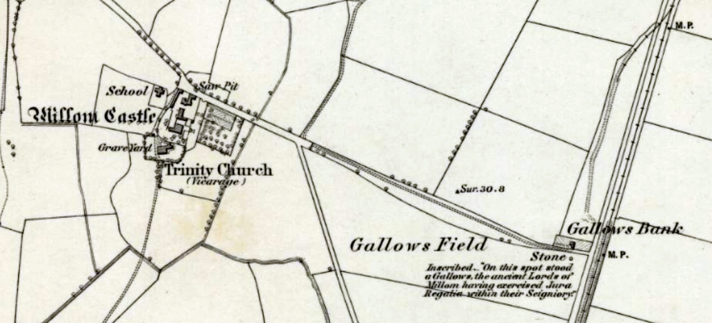 In about 1860 a commemorative stone was erected in the Gallows field, on it was inscribed 'On this spot stood a Gallows the ancient Lords of Millom having exercised Jura Regalia within their Seigniory.' The stone has since been moved to the side of the field and can be seen at the bottom of the lane on the left side (looking upwards towards the castle) but the inscription is no longer visible.