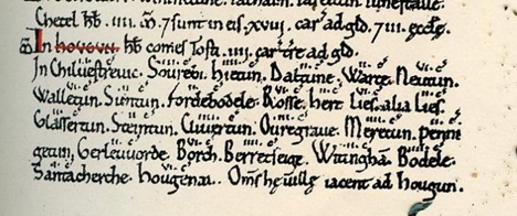 Translated, this says: In Hougun Manor Earl Tosti had four carucates rateable to the geld. In Chiluestreuic iii c., Sourebi iii c., Hietun iiii c., Daltune ii c., Warte ii c., Neutun vi c., Walletun vi c., Suntun ii c., Fordebodele ii c., Rosse vi c., Hert ii c., Lies vi c., Alia Lies ii c., Glassertun ii c., Steintun ii c., Clivertun iiii c., Ouregrave iii c., Meretun iiii c., Pennigetun ii c., Gerleuuorde ii c., Borch vi c., Beretsiege iiii c., Witingham iiii c., Bodele iiii c., Santacherche i c., Hougenai vi c.. All these vills belong to Hougun.